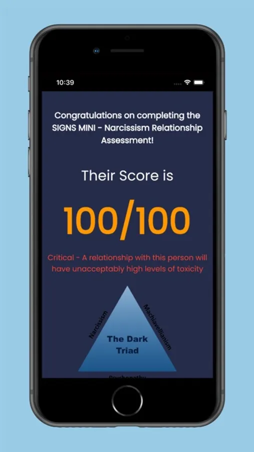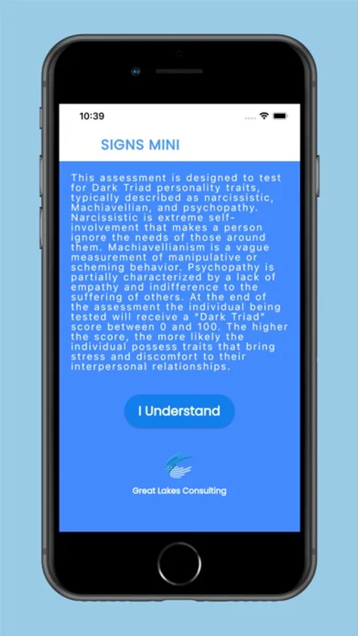 This assessment is designed to test for Dark Triad personality traits, typically described as narcissistic, Machiavellian, and psychopathy. Narcissistic is extreme self-involvement that makes a person ignore the needs of those around them. Machiavellianism is a vague measurement of manipulative or scheming behavior. Psychopathy is partially characterized by a lack of empathy and indifference to the suffering of others. At the end of the assessment the individual being tested will receive a "Dark Triad" score between 0 and 100. The higher the score, the more likely the individual possess traits that bring stress and discomfort to their interpersonal relationships.