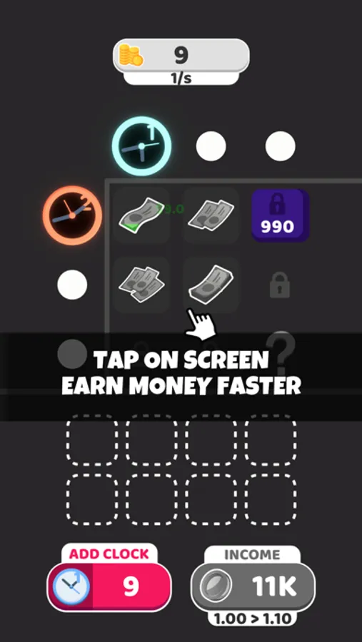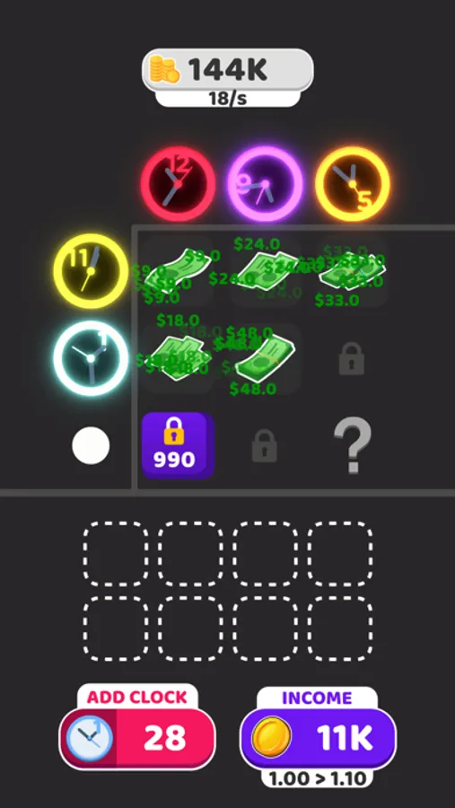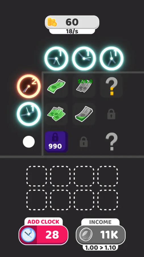 - Add more clocks and earn more money!