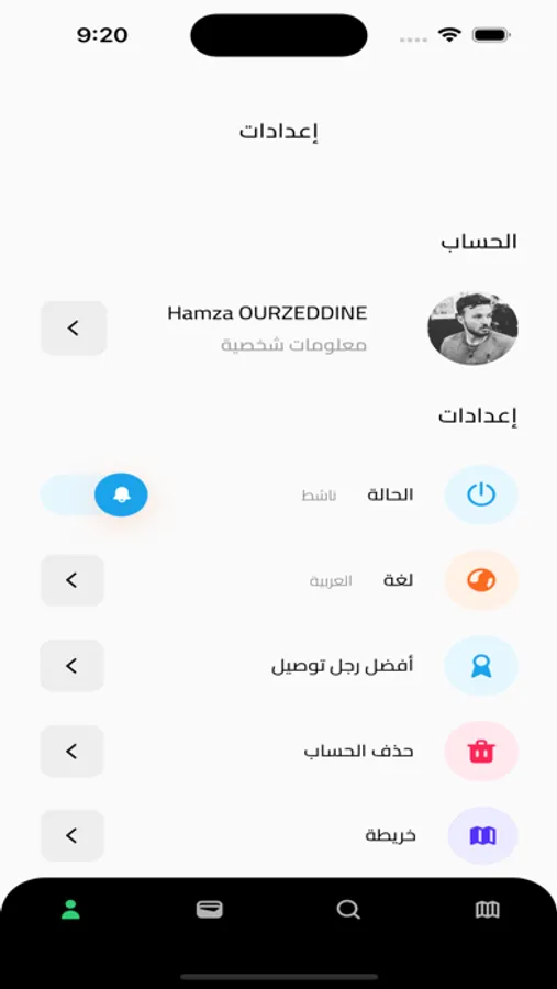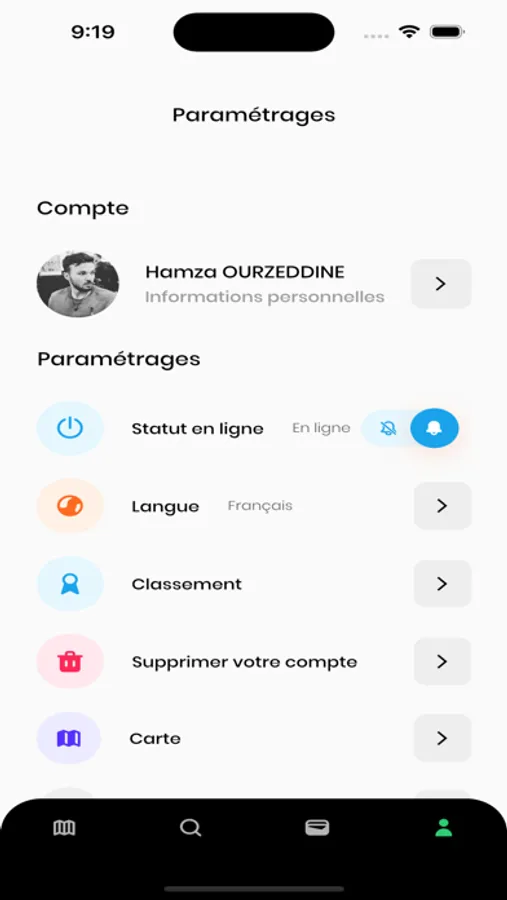 - le profil, où li livreur peut mettre son statut en mode on/off, changer la langue, changer la sonnerie, choisir le navigateur MAP, voir son classement et aussi déconnecté.