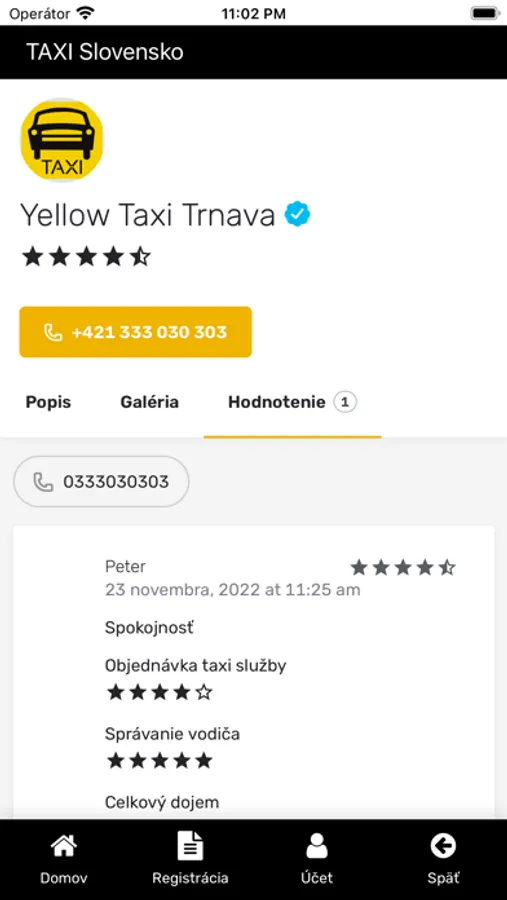 TAXI Slovensko je aplikácia pre nás všetkých. Databáza TAXI služieb z celého Slovenska v jednej aplikácii. Stiahnite si zadarmo aplikáciu do vášho telefónu a už nebudete mať nikdy problém s hľadaním telefónneho čísla alebo iných informácií o vašej obľúbenej TAXI službe.