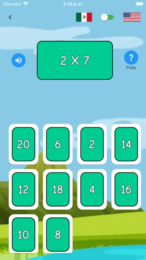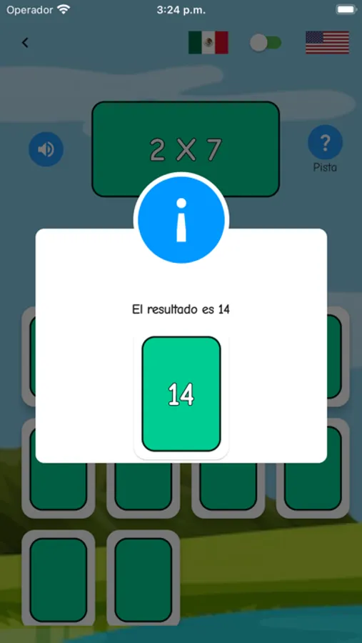 • ¿Para qué sirven los botones del tablero? En el juego hay 2 botones uno de una bocina que ese te permite usar la aplicación con o sin sonido, está en inglés y español, y el “?” te da el resultado de la multiplicación mas no te dice dónde está la tarjeta correcta.
