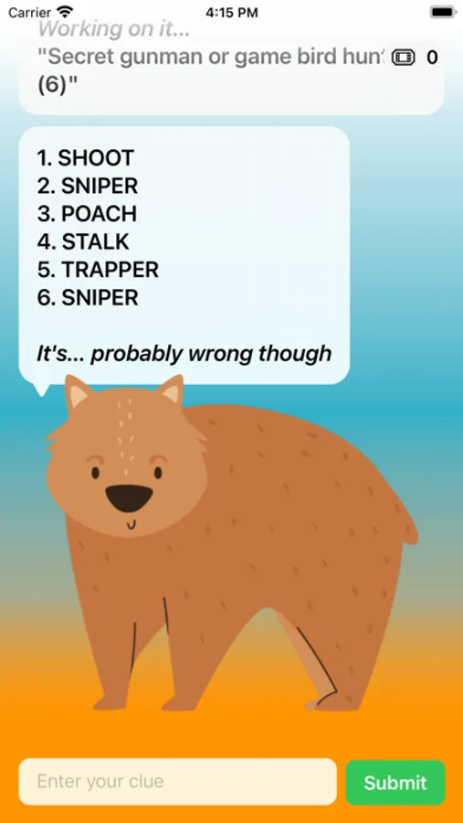 Introducing "Cryptic Wombat", the app that features a lovable wombat as its mascot and attempts to solve cryptic crossword clues for you.