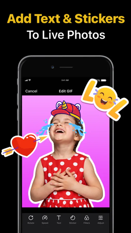 Wondering how to edit a GIF on iPhone before sharing it online? GIF Maker features all the necessary tools to personalize GIFs the way you want. Once you choose the photos or a video, you can use the GIF speed changer to speed up or slow down a GIF. You can also rotate, adjust brightness, saturation, contrast, etc., and add filters to enhance your GIFs.