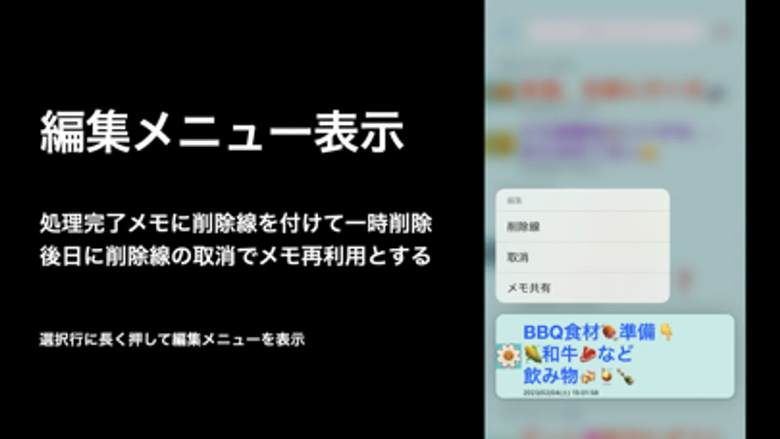 ー編集オプションメニューより削除線付き・削除線の取消・電話番号識別&掛ける・メモ共有