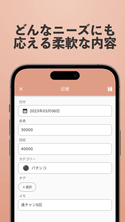 例えば、支出のタグに「出玉」といった項目を追加することで、パチンコやパチスロでの収支を細かく管理することができます。
