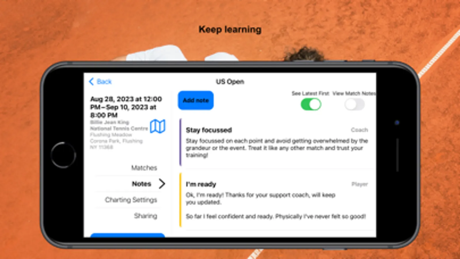 - Tennis specific support & review tools. If you want to track shot by shot matches, we've got you covered. If you also want to just take note of outcomes, develop your own between points routine to support your child... we also got you covered!