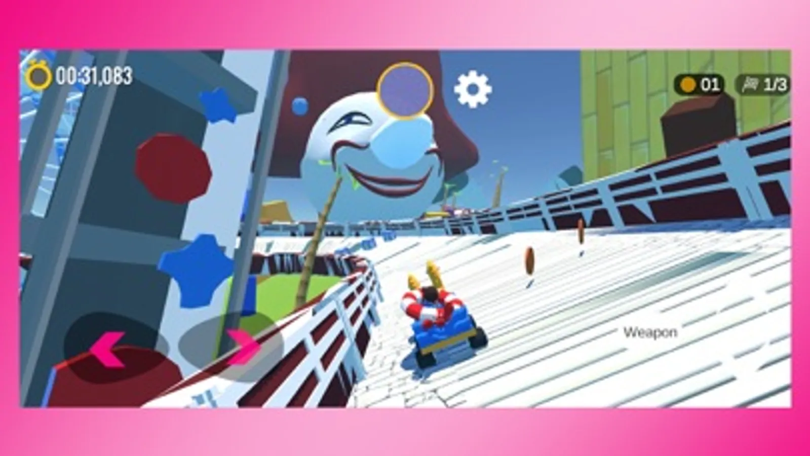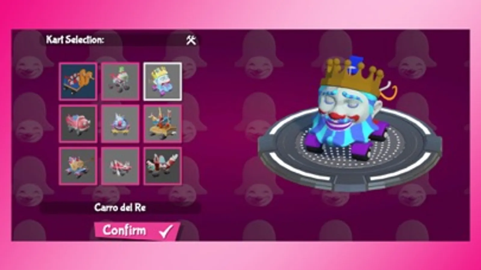 E' possibile scegliere la propria vettura preferita tra una serie di mini carri che dovranno macinare l'asfalto di 6 piste psichedeliche che ricordano posti già noti, come la Cittadella del Carnevale, il lungomare di Viareggio, ma anche le Mura storiche di Lucca, e ambienti totalmente immaginari come l'Antro di Re Carnevale e il Multiverso delle Maschere Sperdute.