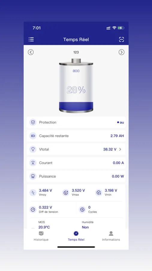 3) Affichage des informations détaillées sur le fonctionnement de la batterie dans l'onglet "Temps Réel", y compris : le pourcentage d'état de charge, la tension, le courant, la température de la batterie, etc.