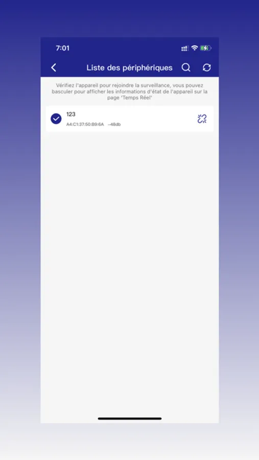 2) L’application détecte et répertorie votre/vos batterie(s) à distance. Retrouvez et connectez/déconnectez-vous à vos batteries en les recherchant dans l’onglet « Liste des périphériques »