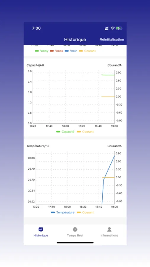 4) Retrouvez les historiques des derniers jours concernant les variations de tension, de capacité ou de température via l’onglet « Historique »