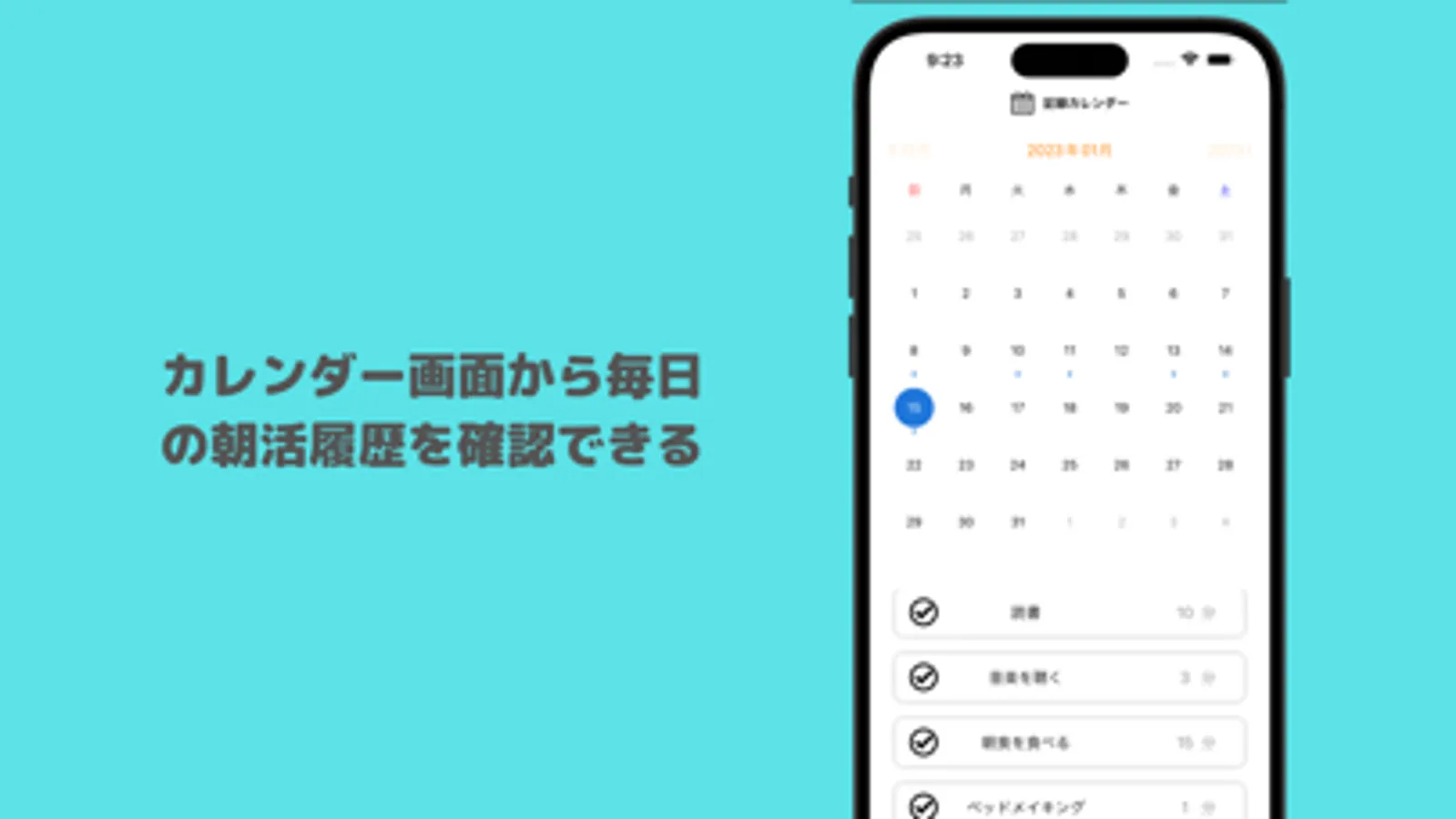 あなたが過去に頑張った朝活履歴をカレンダー画面で確認できます。