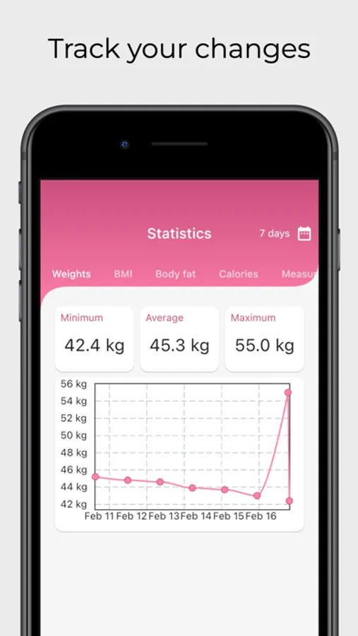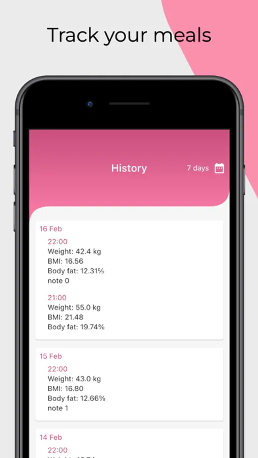 You can quickly and easily check your data history on a line chart with the date range selected by you. It can be 7 days, 30 days, or any custom range. If you prefer to track your progress on weight loss by text list, you can do it on the history tab where each data you enter is shown separated by days.