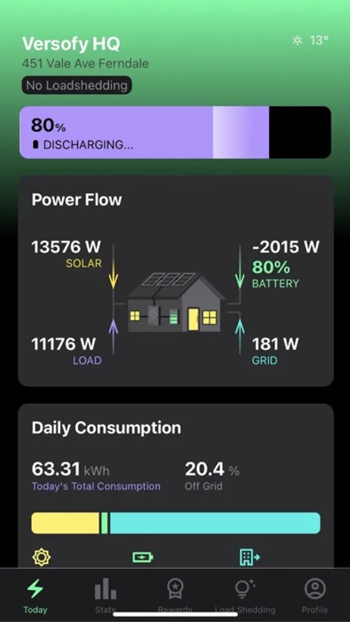 Using the Versofy HOME app, you can effortlessly monitor your solar system to keep an eye on real-time metrics such as battery level or power usage, review historical statistics, and much more. You can also control how your system reacts to load shedding.