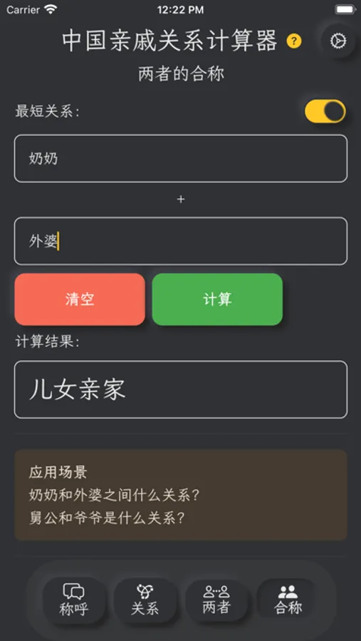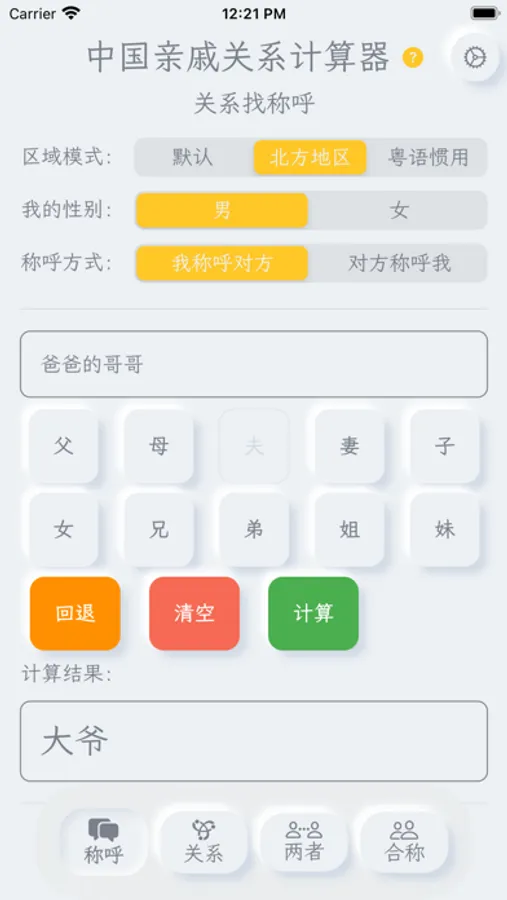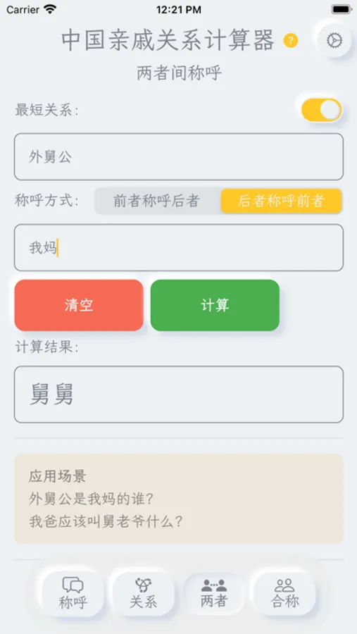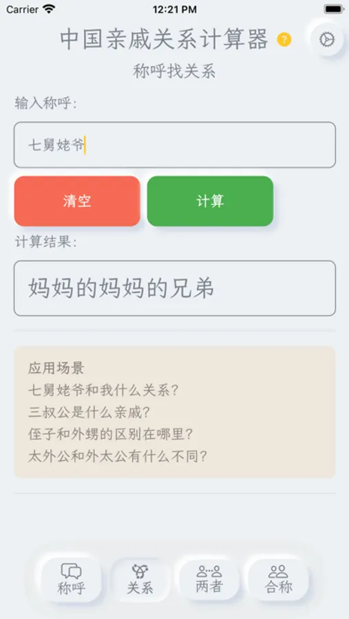 “亲戚关系计算器”为你避免了叫错、不会叫亲戚的尴尬,收录了中国亲戚关系称呼大全,只需简单的输入即可完成称呼计算。称呼计算器同时兼容了不同地域的方言叫法,你可以称呼父亲为:“老爸”、“爹地”、“老爷子”等等。让您准确的叫出亲戚称谓,理清亲属之间的亲戚关系,轻松掌握中国式的亲戚关系换算,让你更了解中国文化。