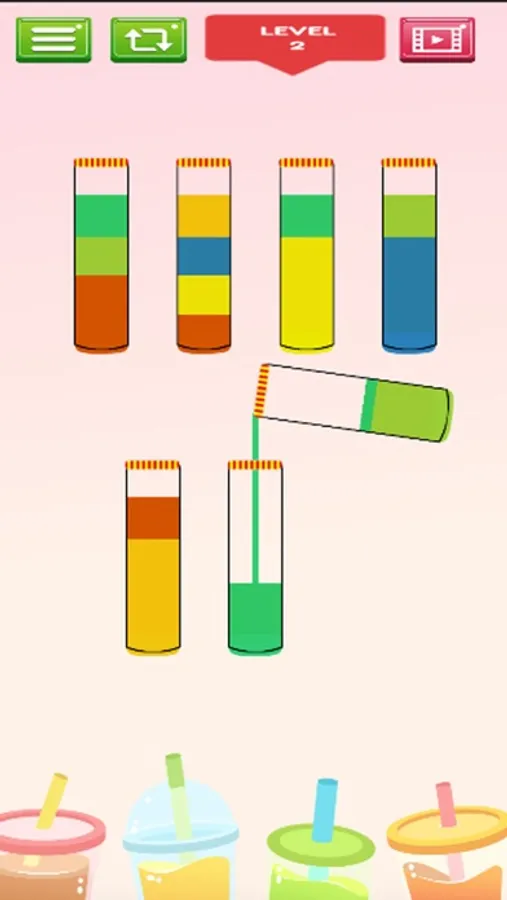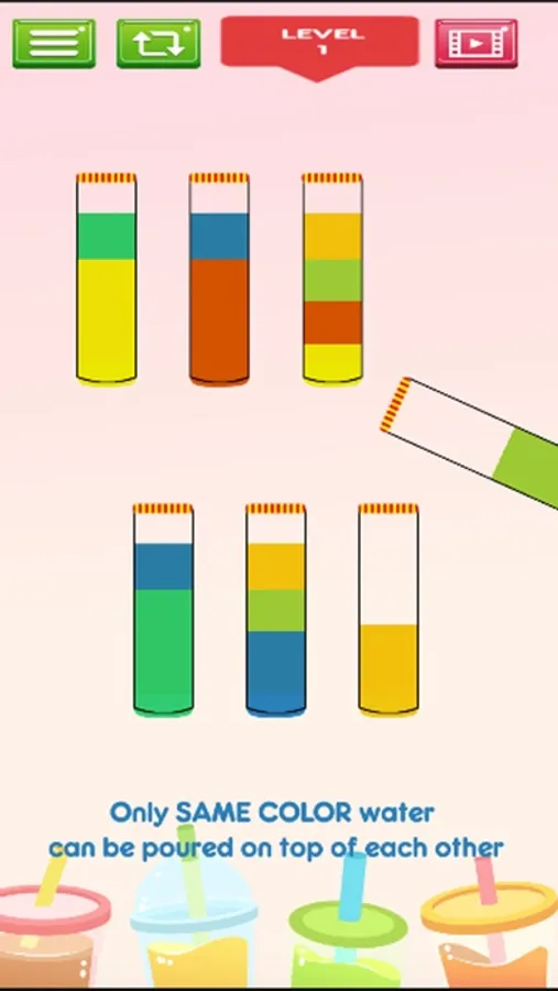 - The rule is that you can only pour the water if it is linked to the same color and there’re enough space on the glass.