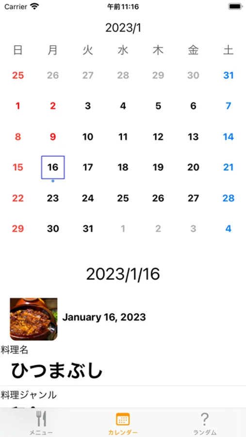 ・カレンダー機能では登録した日が分かるようになっており、過去に食べた料理を簡単に見返すことができます。