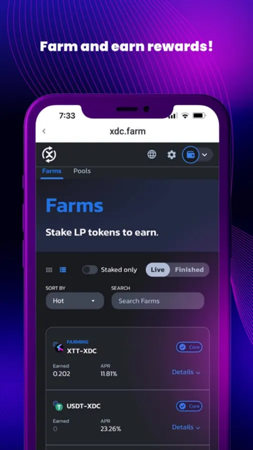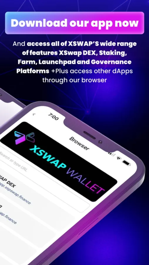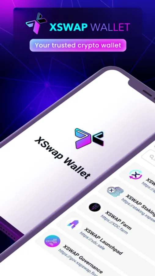 It gives the user the ability to interact with various distributed apps. In the main screen, user can send and receive funds, and monitor their tokens. Through the web browser, users can connect to dApps, with XSwap Protocol AMM DEX, staking, launchpad, farming and governance platforms as defaults, to stake, swap, add liquidity pools, farm LP pools and tokens and access the launchpad and governance platform. XSwap wallet also comes with Wallet Connect which allows the user to easily connect their wallet to dApps and Web3 apps by scanning a QR code.
