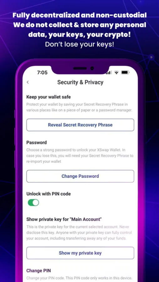 Your funds are completely decentralized when you use XSwap wallet to store your tokens or manage your accounts. You have full control of your crypto with private keys.