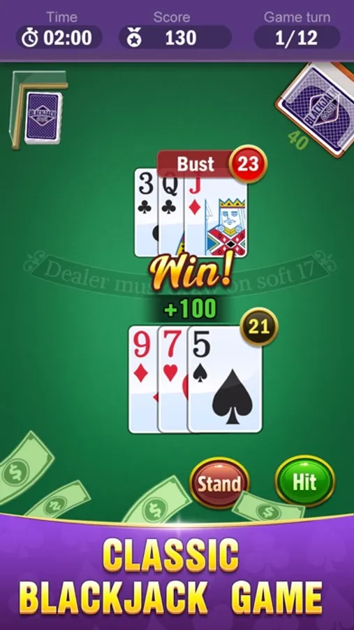 Face cards are worth 10 and Aces are worth either 1 or 10. "Hit" for another card, and get your point as close to 21 as you can without going bust. In a limited time, beat the dealer as much as possible through 12 rounds to win higher scores.