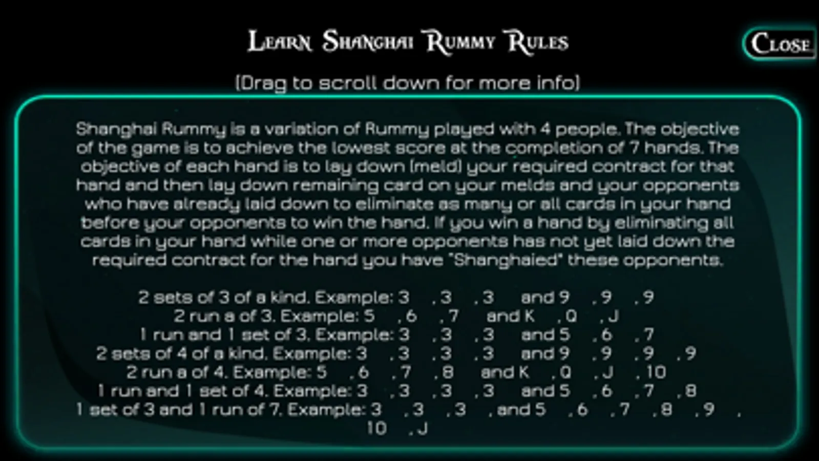 In Shanghai Rummy the objective is simple, defeat your opponents by finishing all 7 contract hands with the lowest final score. What makes this game so fun is that each hand gets more challenging and your opponents more determined to Shanghai you and lock in the lead! Host private matches with friends or join a public quick match to play the world for free today!