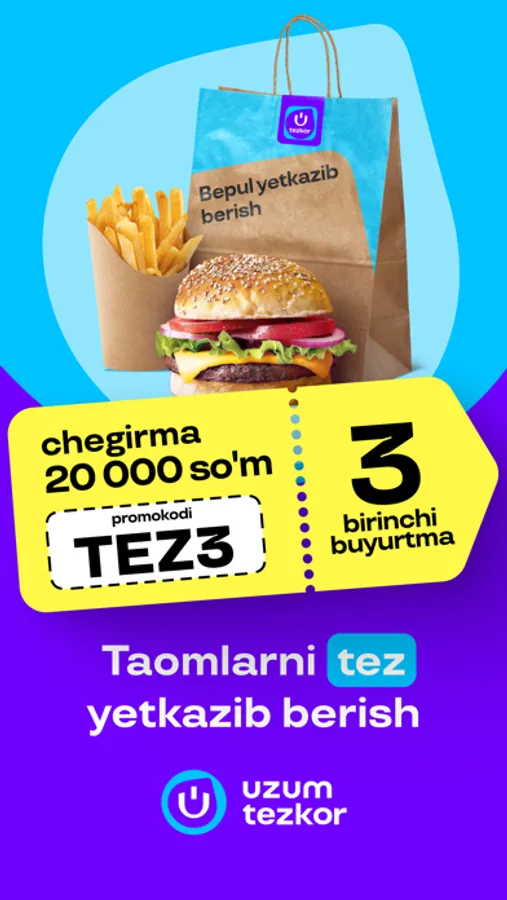 Uzum ekotizimidan kafe va restoranlardan taomlarni yangi tez yetkazib berish servisi. Uyga va ofisga yetkazib berish bilan nonushta, tushlik va kechki ovqat uchun tayyor taomlar. KFC’dan shirin shefburger, Broccoli’dan tushlik yoki Сыроварня dan sirniklar deysizmi? Yetkazib berishni buyurtma qiling – tez va bepul yetkazib beramiz.