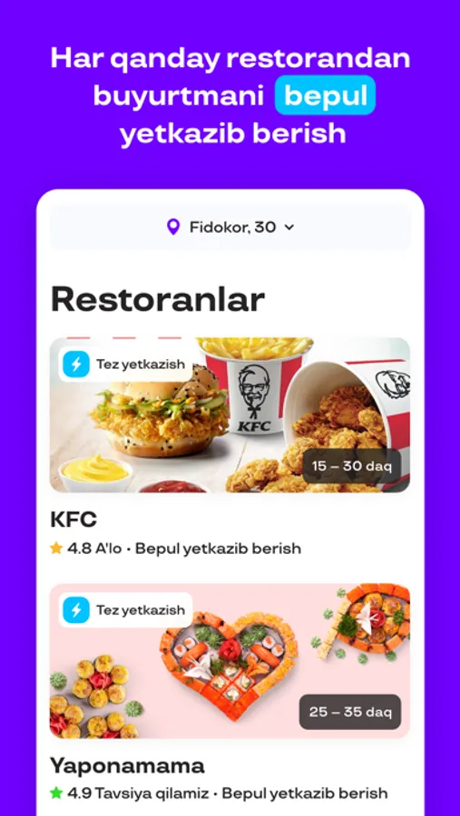 Manzilingizni kiriting, buyurtma bering – va taxminan 30 daqiqadan so'ng dasturxoningizda mazali taomlar turadi.