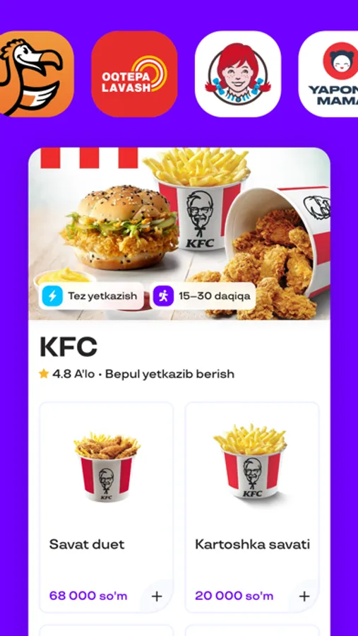 KFC, FeedUP, Oqtepa Lavash, Max Way, Wendy’s, Yaponomama, Bon!, Додо ПиццаTeriyaki, Roni Pizza va boshqa mashhur muassasalardan ovqat buyurtma qilishingiz yoki yangi taomnomani kashf qilishingiz mumkin. Palov, pitsa, sushi yoki burgerlar – o‘z didingizga qarab tanlang.