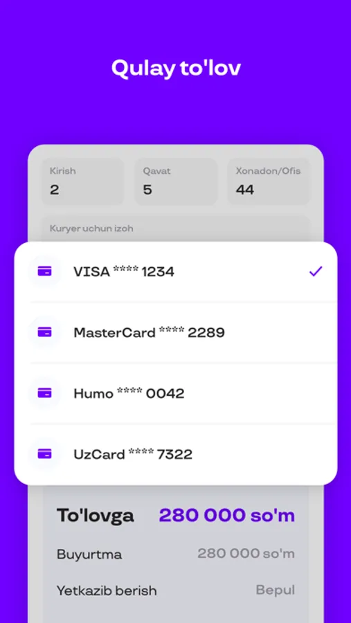 To'lov avtomatik ravishda ilovada bog'langan bank kartasidan yechib olinadi, birinchi buyurtma paytida uning rekvizitlarini kiriting.