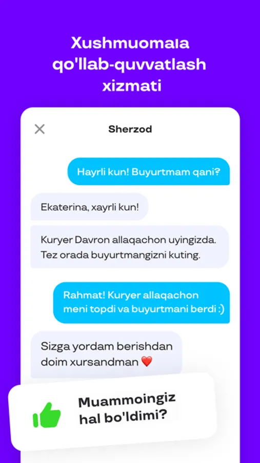 Вежливые специалисты нашей службы поддержки оперативно ответят на узбекском или русском языках и помогут решить любые вопросы, связанные с доставкой заказа.
