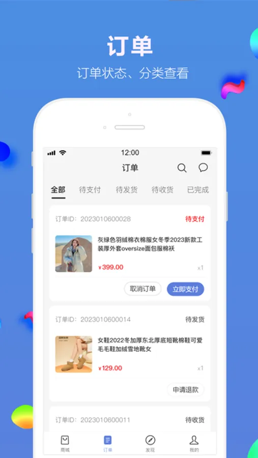 1、支持商品分类查询、一件下单支付、查看订单状态等;