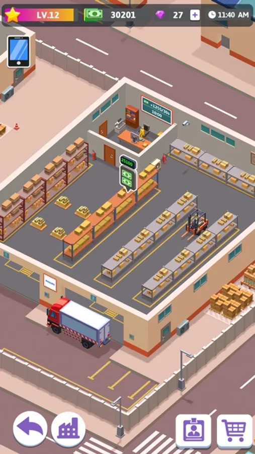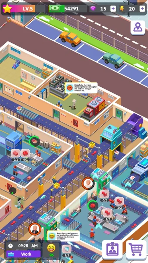 Highly productive employees are needed. According to your current demand and development strategy, fire and hire for these positions: processor, stevedore, maintainer, cleaner, and director. Every department does its part to keep the factory going. Optimize each department to increase productivity. Manage teams properly and earn as much revenue as you can.