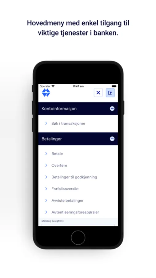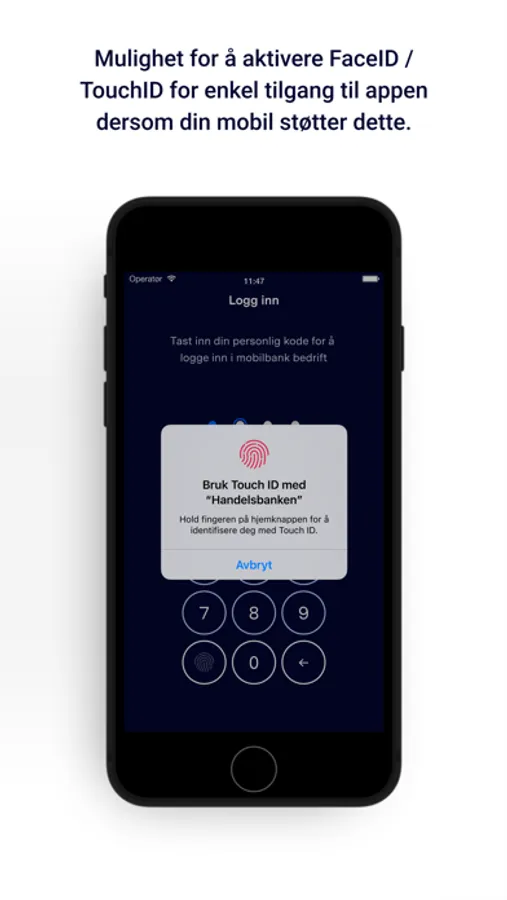Når du har lastet ned appen må du registrere deg og identifisere deg med BankID eller BankID på Mobil. Under aktivering setter du en 4-sifret personlig kode som kan brukes til innlogging og signering av betaling. Hvis telefonen din støtter biometri kan du også aktivere dette, og dermed bruke Touch ID / Face ID i stedet for din personlige kode. Innlogging og betaling blir enklere.