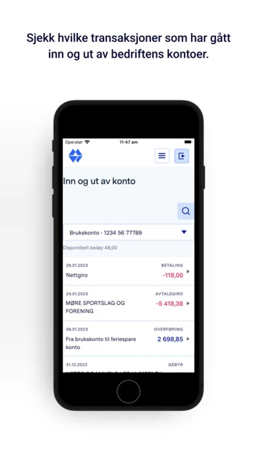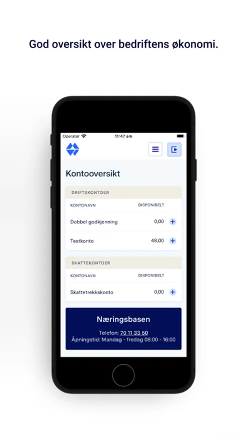 Få god oversikt over økonomien også når du er på farten. I Mobilbank bedrift kan du enkelt sjekke saldo, overføre og betale fra bedriftens kontoer.