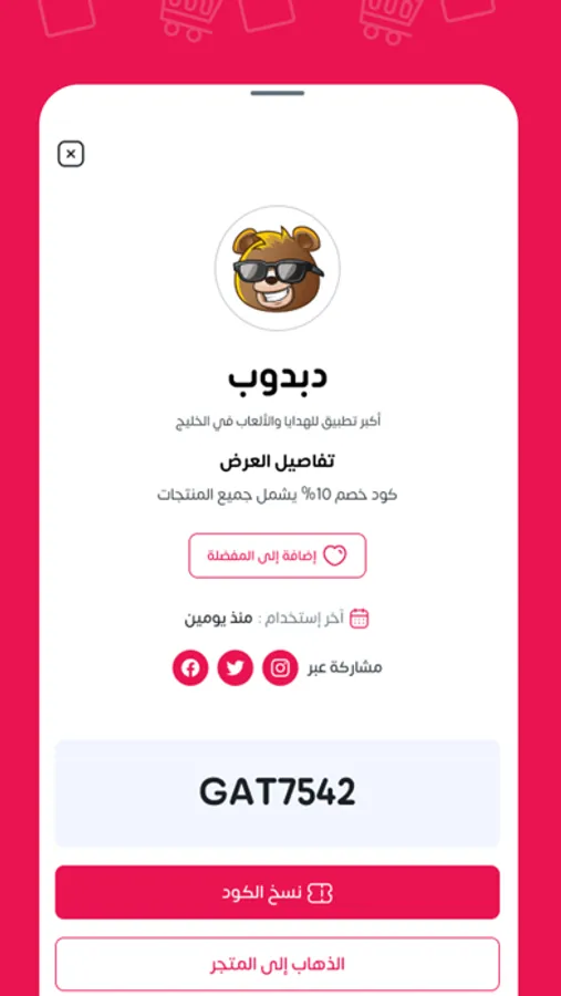 أيضاً يتيح التطبيق اداة سهلة لنسخ الأكواد بشكل سريع وفتح المتجر الأساسي برابط سريع للوصول للعروض مباشرة