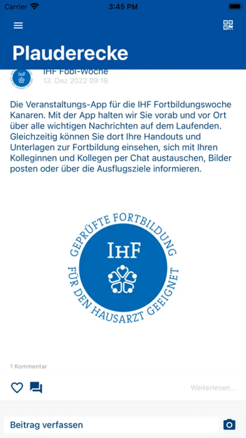 Die Veranstaltungs-App für die IHF Fortbildungswoche Kanaren. Mit der App halten wir Sie vorab und vor Ort über alle wichtigen Nachrichten auf dem Laufenden. Gleichzeitig können Sie dort Ihre Handouts und Unterlagen zur Fortbildung einsehen, sich mit Ihren Kolleginnen und Kollegen per Chat austauschen, Bilder posten oder über die Ausflugsziele informieren.