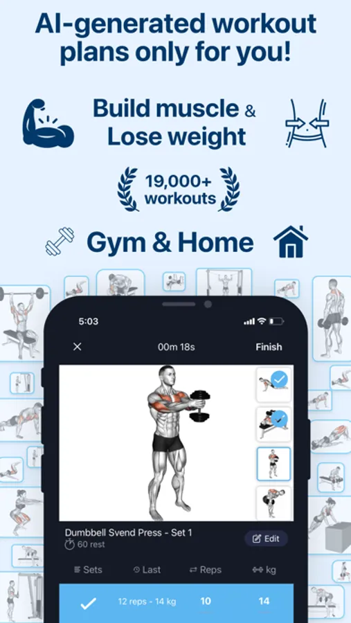 Workout AI can be used as a workout planner for gym or fitness tracker for home. AI learns from your workout history to help you build muscle fast or lose weight quickly.