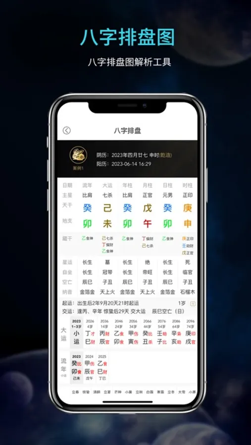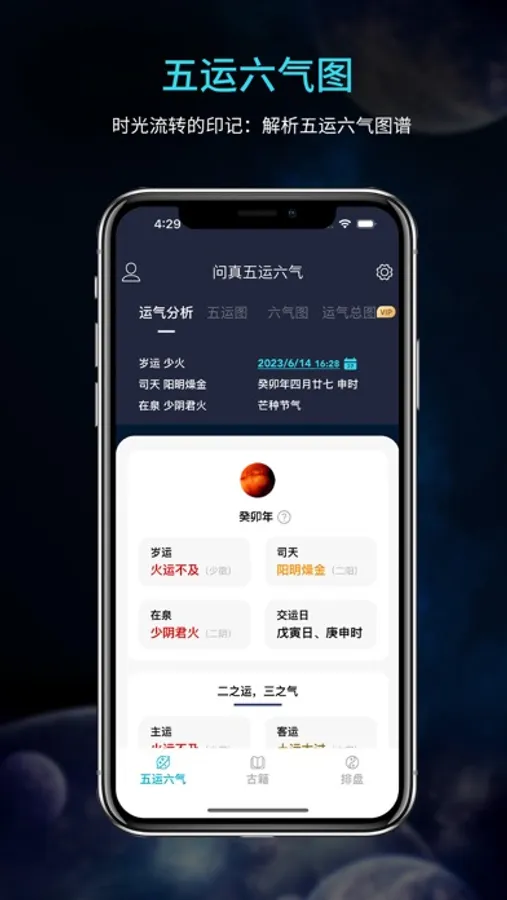 1、五运六气查询:提供准确的五运六气信息,包括岁运、司天、在泉、主运、客运、主气、客气、客主加临等。