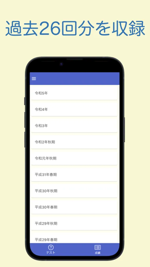 平成21年春期〜令和5年の26回分(2600問)を収録しており、過去問を年代毎に学習できます。