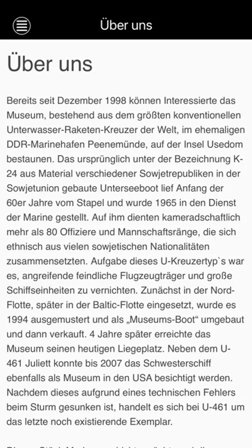 Die App der U-461 Juliett – dem größten Museums U-Boot der Welt, ist der digitale Begleiter Ihres Museumsbesuchs. Hier erleben Sie ein Stück Marinegeschichte hautnah und haben die einmalige Möglichkeit, in eine Welt abzutauschen, die den Menschen ansonsten verborgen bleibt. Wer sich traut, sich zwischen tausenden Hähnen und ein paar tausend Kilometern Kabelsträngen zu begeben, kann mit seinem Besuch erleben, wie sich das Leben für ein Besatzungsmitglied in einem U-Boot wirklich anfühlen muss. Hier können Sie nicht nur auf dem Fernsehbildschirm sehen, wie es der Crew und dem Cast in den Filmklassikern „Das Boot“ oder „Jagd auf Roter Oktober“ ergangen sein könnte, vielmehr können Sie genau dieses Gefühl einmal selbst erleben.