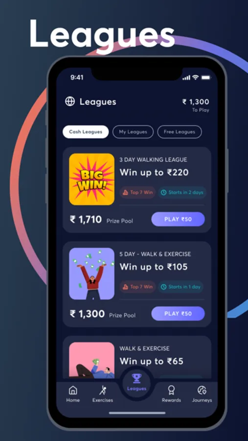 To join our Pay-to-Play leagues, get started with an entry fee. It will be added to the prize pot money. Our Free Leagues encourage you to increase your movement with the element of competition as well - and you can get the chance to win reward coupons and discount codes from brands like Suspire, Amazon, Foxtale, Swiggy, Ace Blend and many more!