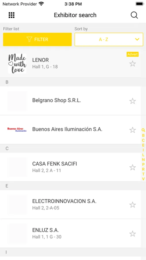 Exhibitors: search for companies and products, filter and sort functions available, also find contact persons ad exhibitor events. Add Photos and Notes to an exhibitor and share them.