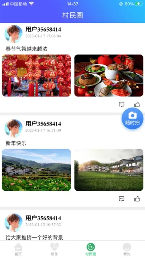 基于乡村为核心的服务平台,包括村圈、概况、服务、我的等功能