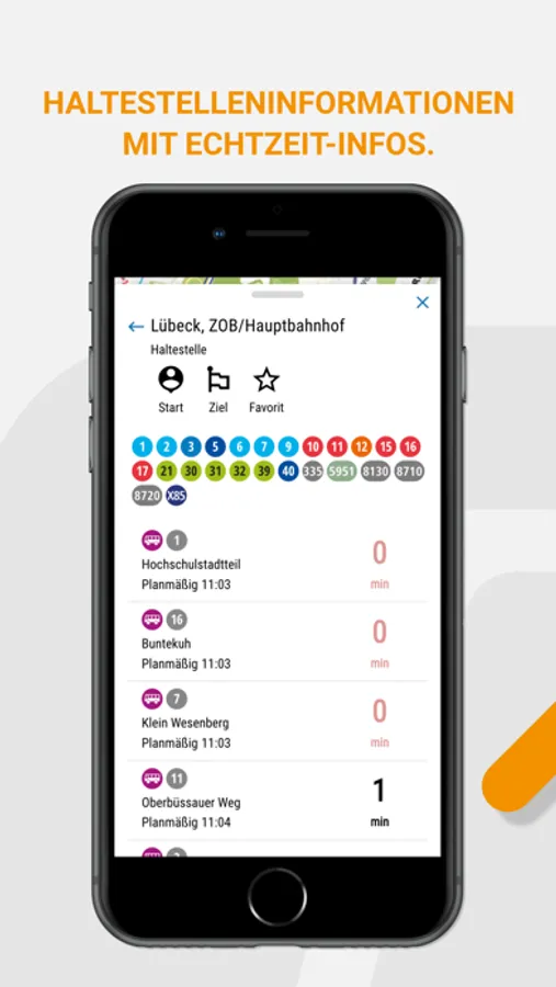 Neben der Darstellung aller Buslinien sowie den beiden Fähren in Travemünde gelangen Sie mit nur einem Klick in die Echtzeitinformationen der Abfahrten an jeder Haltestelle.