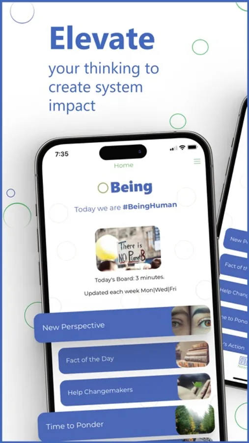 Being is the leading critical thinking app that elevates the world’s zeitgeist towards climate action and positive system change. It will take new perspectives, systems thinking, and paradigm shifts for us to solve our most complex challenges such as climate change and biodiversity loss. The Being app brings this to you in a simple, digestible, and actionable manner. All in under three minutes per day, three times per week.