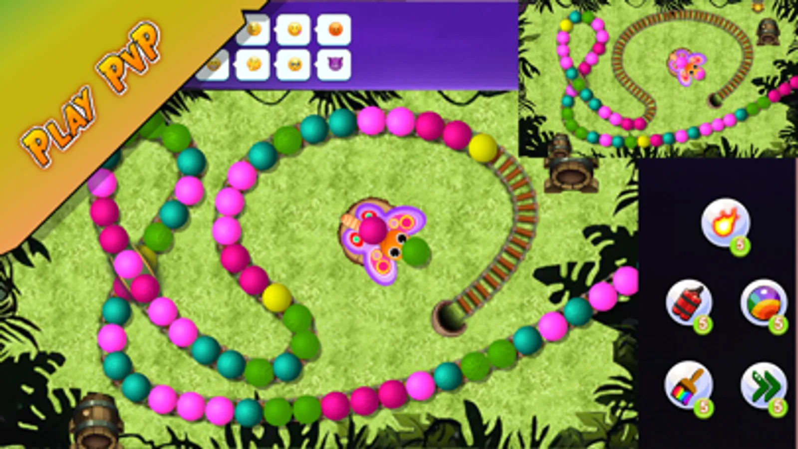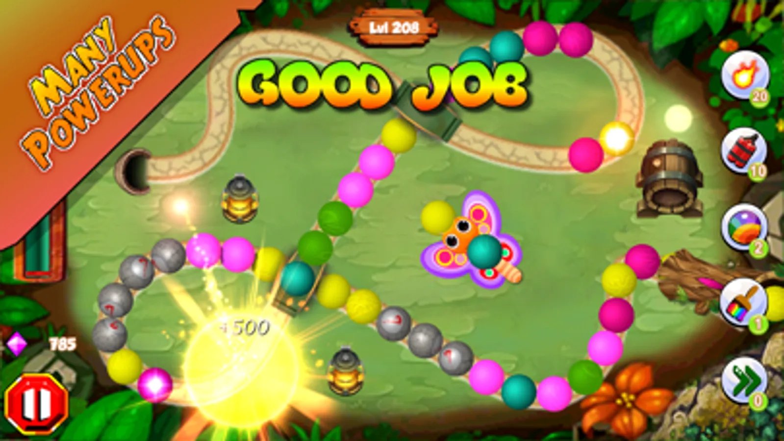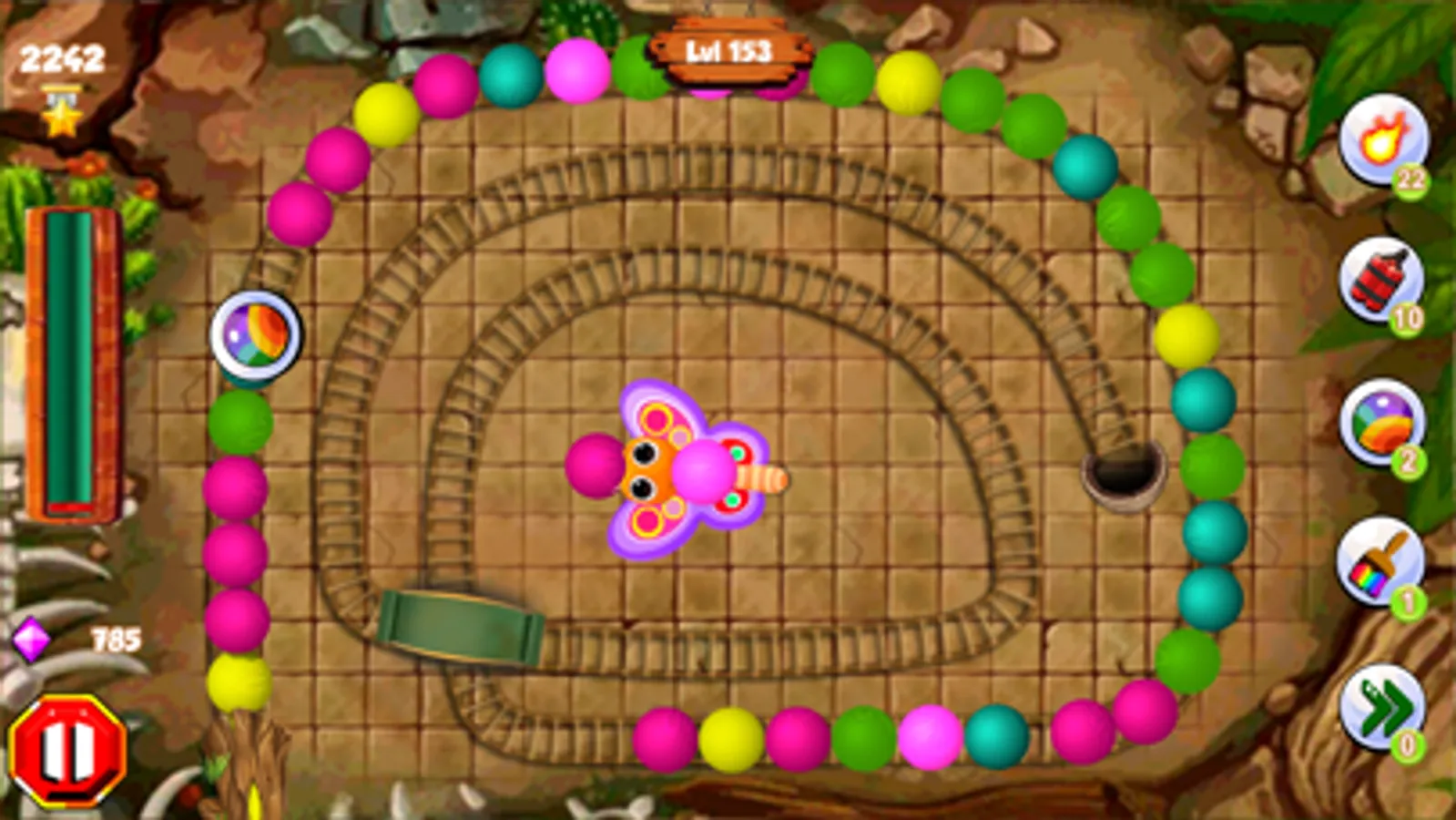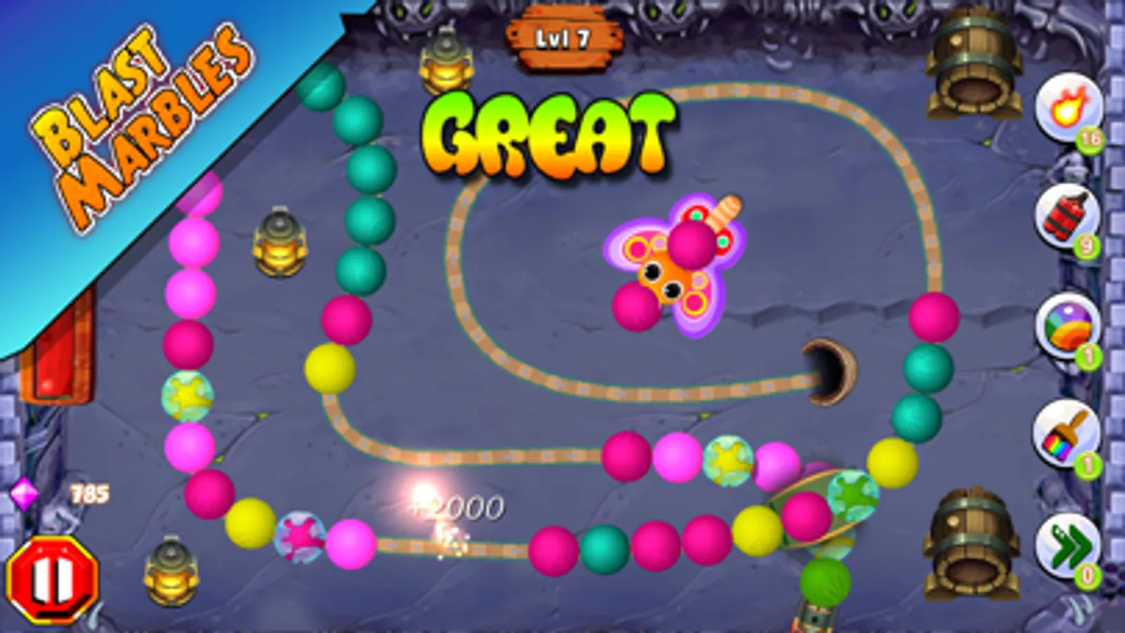 It is easy to play. You should shoot and blast the moving marbles in groups of 3 or more and eliminate the same-colored marbles and gain points. By destroying a large group of marbles at once, you will receive a bonus in the form of bombs, powerful boosters, etc., and earn points.