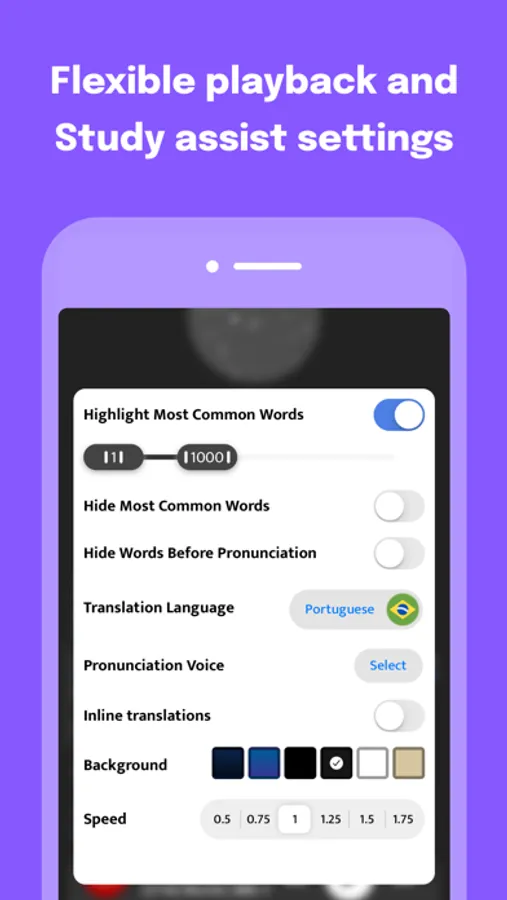 Set custom playback speed, playback voice, word highlighting, top word assist, and custom pronunciation behavior