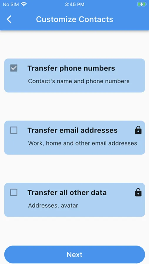 Contacts Transfer is a mobile app that allows users to easily transfer their phone contacts (including phone numbers, emails, and addresses) between devices. With a simple and user-friendly interface, the app makes it easy to transfer contacts from one phone to another, whether you're switching to a new device or just need to share contacts with a friend or family member. Compatible with iOS and other platforms, Contacts Transfer ensures that your important contact information is always safe and accessible.