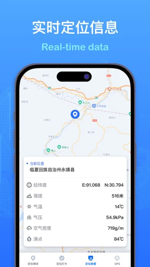 - 实时查询当前地理位置信息,包括:海拔、气压、经纬度、气温、沸点等