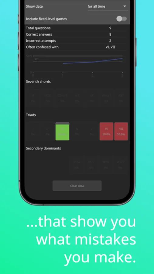 Your performance during practice is analyzed to provide you with detailed statistics that show you where you excel, and what to work on next. You can see exactly how good you are at identifying each of the chords, and what mistakes you make most often.