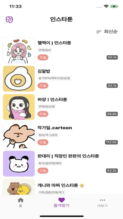 즐겨찾기 : 내가 좋아하는 인스타툰 작가님의 최신글을 알림설정 할 수. 있어요.